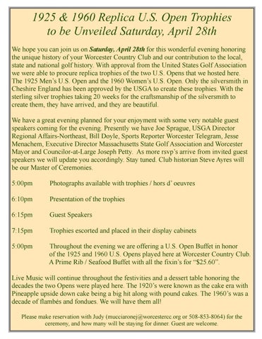 1925 & 1960 Replica U.S. Open Trophies to be Unveiled Saturday, April 28th We hope you can join us on Saturday, April 28th for this wonderful evening honoring the unique history of your Worcester Country Club and our contribution to the local, state and national golf history. With approval from the United States Golf Association we were able to procure replica trophies of the two U.S. Opens that we hosted here. The 1925 Men’s U.S. Open and the 1960 Women’s U.S. Open. Only the silversmith in Cheshire England has been approved by the USGA to create these trophies. With the sterling silver trophies taking 20 weeks for the craftsmanship of the silversmith to create them, they have arrived, and they are beautiful. We have a great evening planned for your enjoyment with some very notable guest speakers coming for the evening. Presently we have Joe Sprague, USGA Director Regional Affairs-Northeast, Bill Doyle, Sports Reporter Worcester Telegram, Jesse Menachem, Executive Director Massachusetts State Golf Association and Worcester Mayor and Councilor-at-Large Joseph Petty. As more rsvp’s arrive from invited guest speakers we will update you accordingly. Stay tuned. Club historian Steve Ayres will be our Master of Ceremonies. 5:00pm