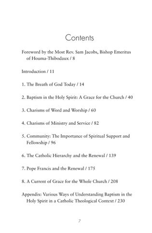 Contents Foreword by the Most Rev. Sam Jacobs, Bishop Emeritus of Houma-Thibodaux / 8 Introduction / 11 1. The Breath of God Today / 14 2. Baptism in the Holy Spirit: A Grace for the Church / 40 3. Charisms of Word and Worship / 60 4. Charisms of Ministry and Service / 82 5. Community: The Importance of Spiritual Support and Fellowship / 96 6. The Catholic Hierarchy and the Renewal / 139 7. Pope Francis and the Renewal / 175 8. A Current of Grace for the Whole Church / 208 Appendix: Various Ways of Understanding Baptism in the Holy Spirit in a Catholic Theological Context / 230
