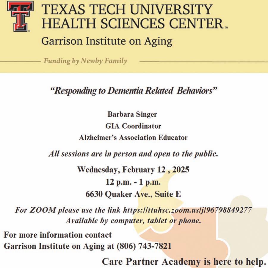 The February topic is “Responding to Dementia-Related Behaviors.” The session begins at noon and will go until 1 p.m. The event is available on ZOOM (see ad for link) and also recorded for later viewing. It is held at the southwest campus, 6630 S Quaker Ave, Suite E. Light refreshments are served.