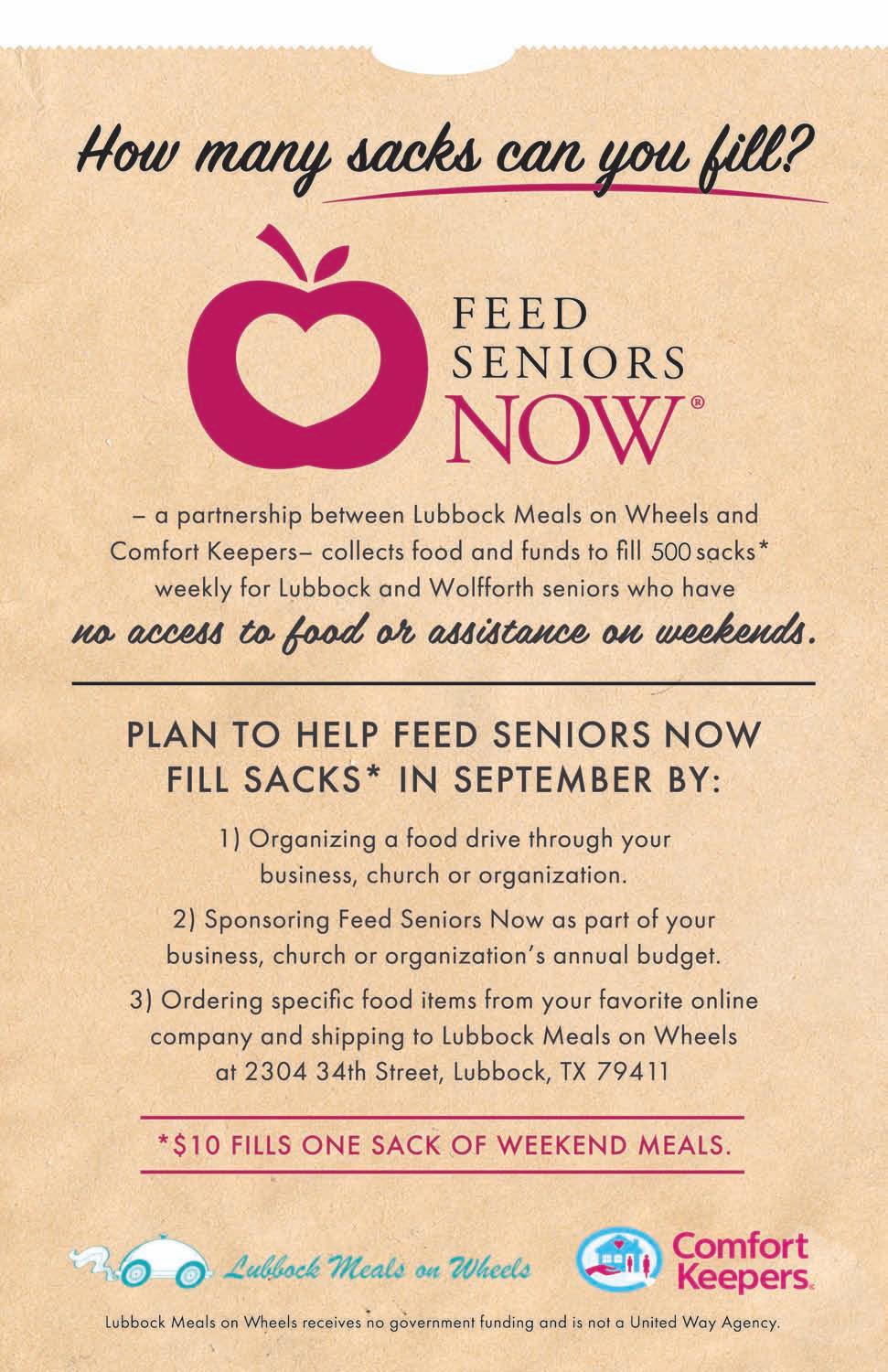 Through the 13th annual Feed Seniors Now initiative in September, Comfort Keepers is partnering with Lubbock Meals on Wheels to collect food and funds to fully support the weekend meal program. Clients of this program have no other means to obtain weekend food other than through Meals on Wheels.