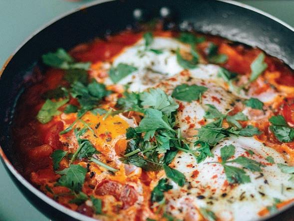 5. Use a large spoon to make small wells in the sauce and crack the eggs into each well. Cook for 5 to 8 minutes, or until the eggs are done to your liking. Cover the pan to cook the eggs faster.