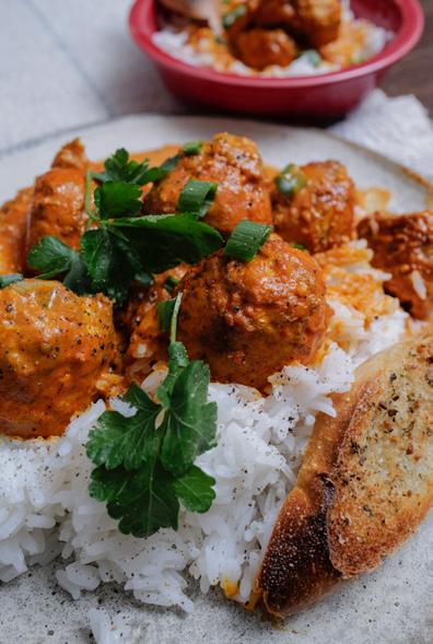 For the sauce, add the butter to the skillet, then stir in garlic and ginger and cook for 1 minute. Add the tomato sauce, tomato paste, garam masala, smoked paprika, turmeric, cumin, coriander and chicken broth. Bring the sauce to a boil, then reduce to a simmer and cook for 10 minutes or until slightly thickens. Stir in the cream. Return meatballs to skillet and let them simmer in the sauce until heated through. Garnish with parsley and serve.