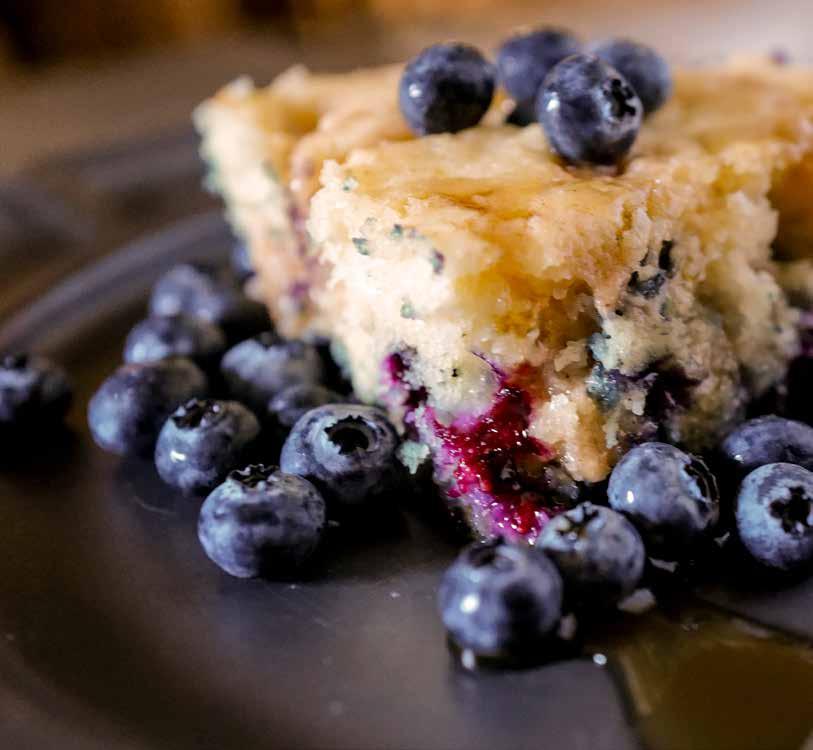 Pour the batter into the greased baking dish. Sprinkle the blueberries over the top. Remove the crumb topping from the fridge and crumble over the top of the blueberries and batter. Bake for 35-45 minutes, until puffed and light golden brown. Use a toothpick to check the center for doneness. Serve warm with maple syrup.