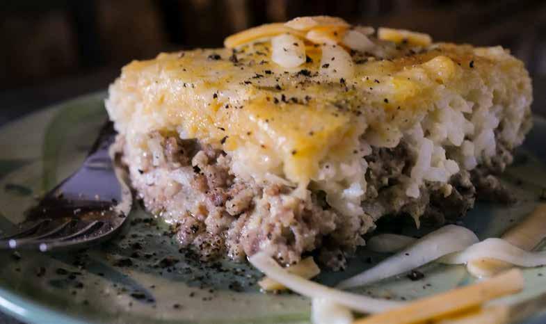 Grease a 9-by-13-inch baking dish. Ladle a layer of sauce into the dish followed by a layer of scrambled eggs. Repeat layers, ending with a layer of sauce. Garnish with mushrooms and bacon. Cover with foil and bake at 275 F for 1 hour.