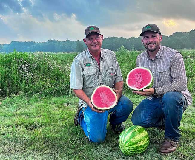 LEFT: Tyler, right, and his uncle, Alfred Froberg, show off watermelons grown at Froberg’s Farm. BELOW: Tyler enjoys making social media videos with his sons, or, as he calls them online, “Little Farmer Frobergs.” Tyler and his son, Dustin, have fun sharing gardening lessons.