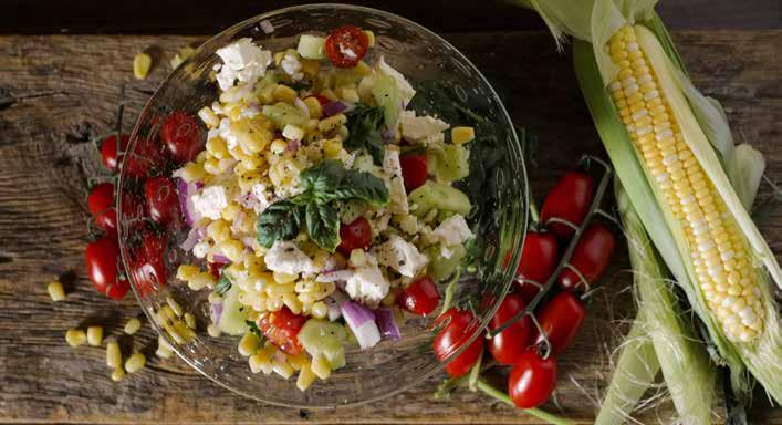 In a large bowl, combine the corn kernels, cherry tomatoes, cucumbers, feta cheese and red onion. Drizzle the olive oil and vinegar over the salad.