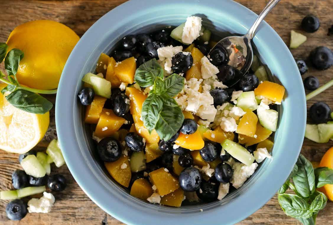 In a large serving bowl combine the blueberries, peaches, cucumbers and feta.