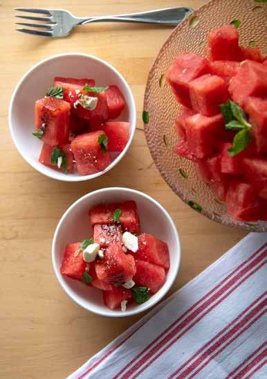 about 5 minutes. It will thicken as it cools and only yield a few tablespoons. Set it aside to cool while you prepare the salad. Cut the watermelon into cubes or use a melon baller to scoop it into balls. Put the melon pieces in a large bowl.