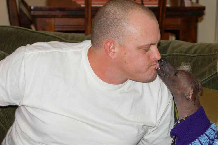 LEFT: Spyder’s tendency to jump in laps and lick faces helped calm and center Leif Mesinger when he became frustrated.