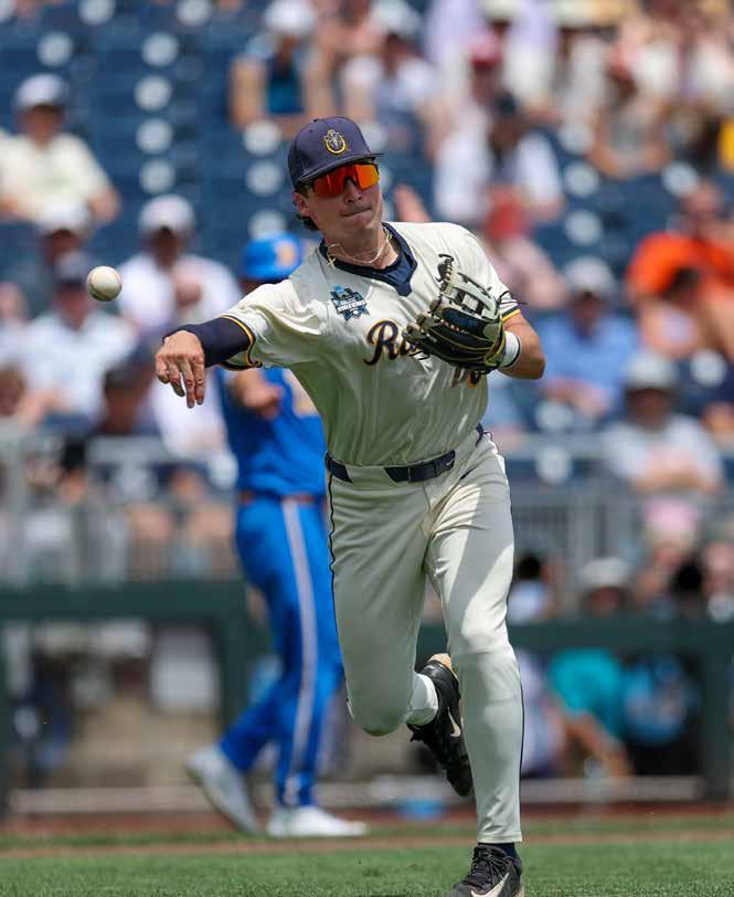 That energy carried the team to a Regional Tournament Championship, a hard-fought series win over Duke in the Super Regional Championship and, eventually, games against UCLA and third-ranked Arkansas in the College World Series. For Isaac, who pitched in many of the Racers’ biggest matchups, the great est pressure came from his sense of responsibility to the team.