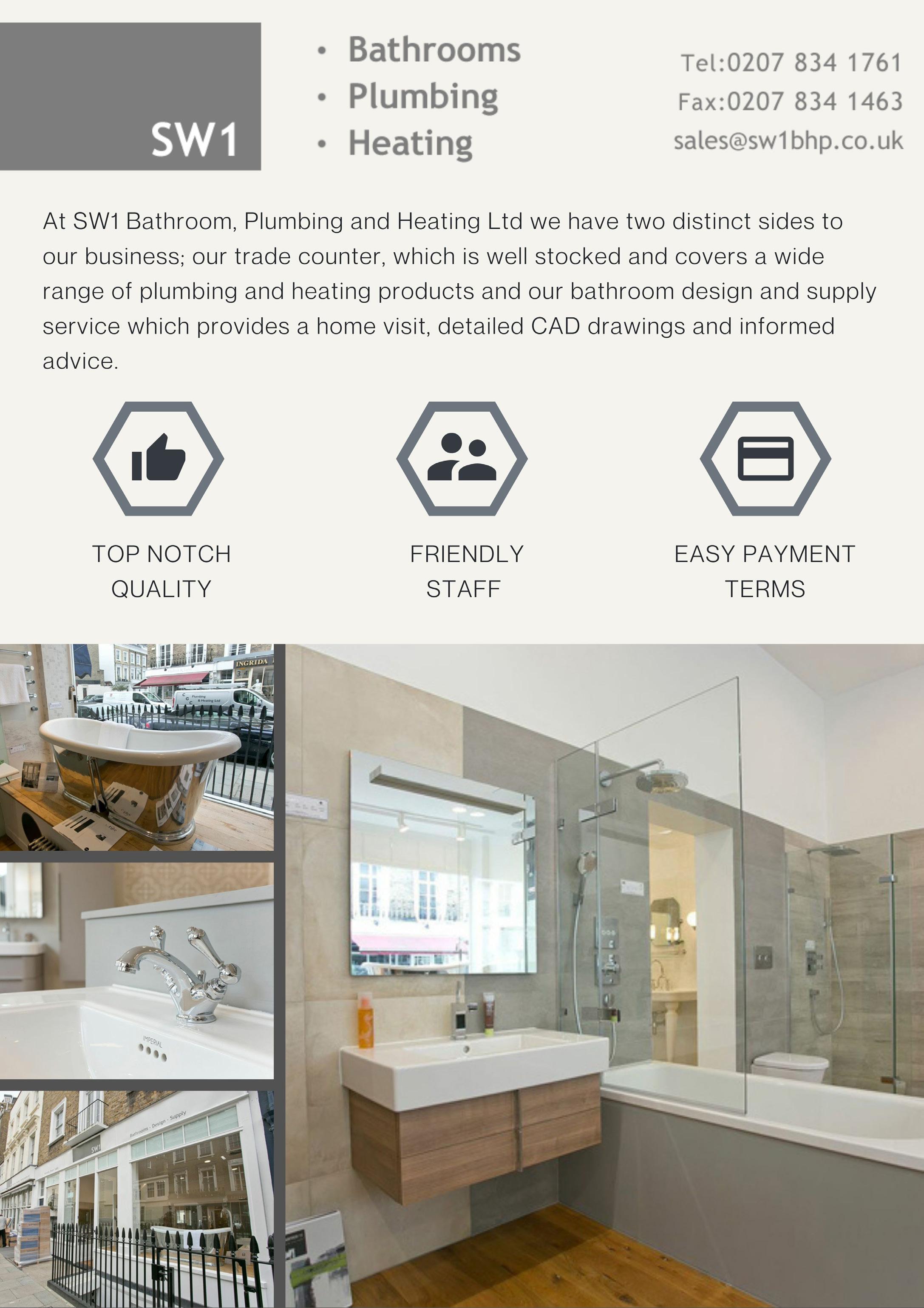 At SW1 Bathroom, Plumbing and Heating Ltd we have two distinct sides to our business; our trade counter, which is well stocked and covers a wide range of plumbing and heating products and is serviced by our experienced staff, and our bathroom design and supply service which provides a home visit, detailed CAD drawings and informed advice.