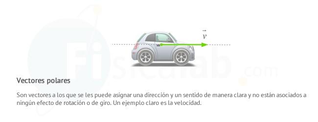 Vectores polares: Son aquellos vectores a los que se les puede asignar una dirección y un sentido de manera clara. No están ligados a ningún efecto de rotación o de giro. Por ejemplo la fuerza o la velocidad.