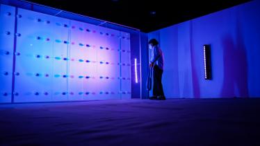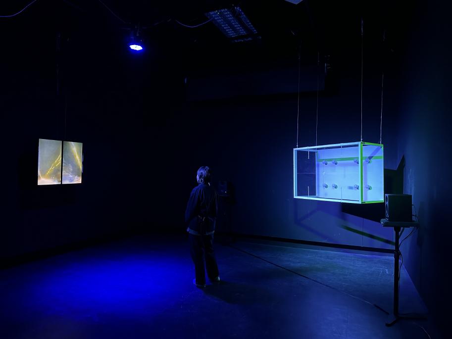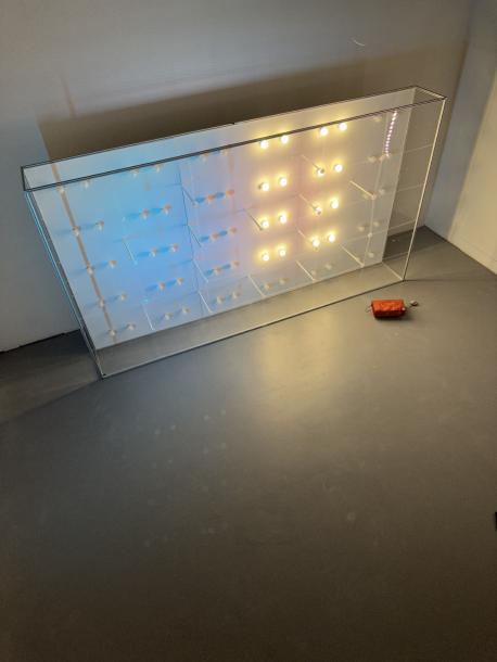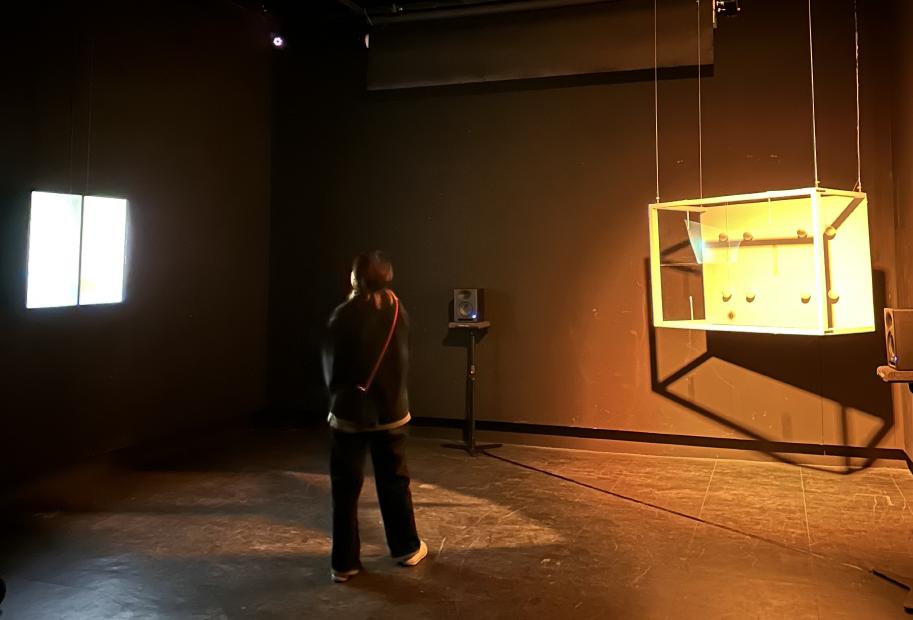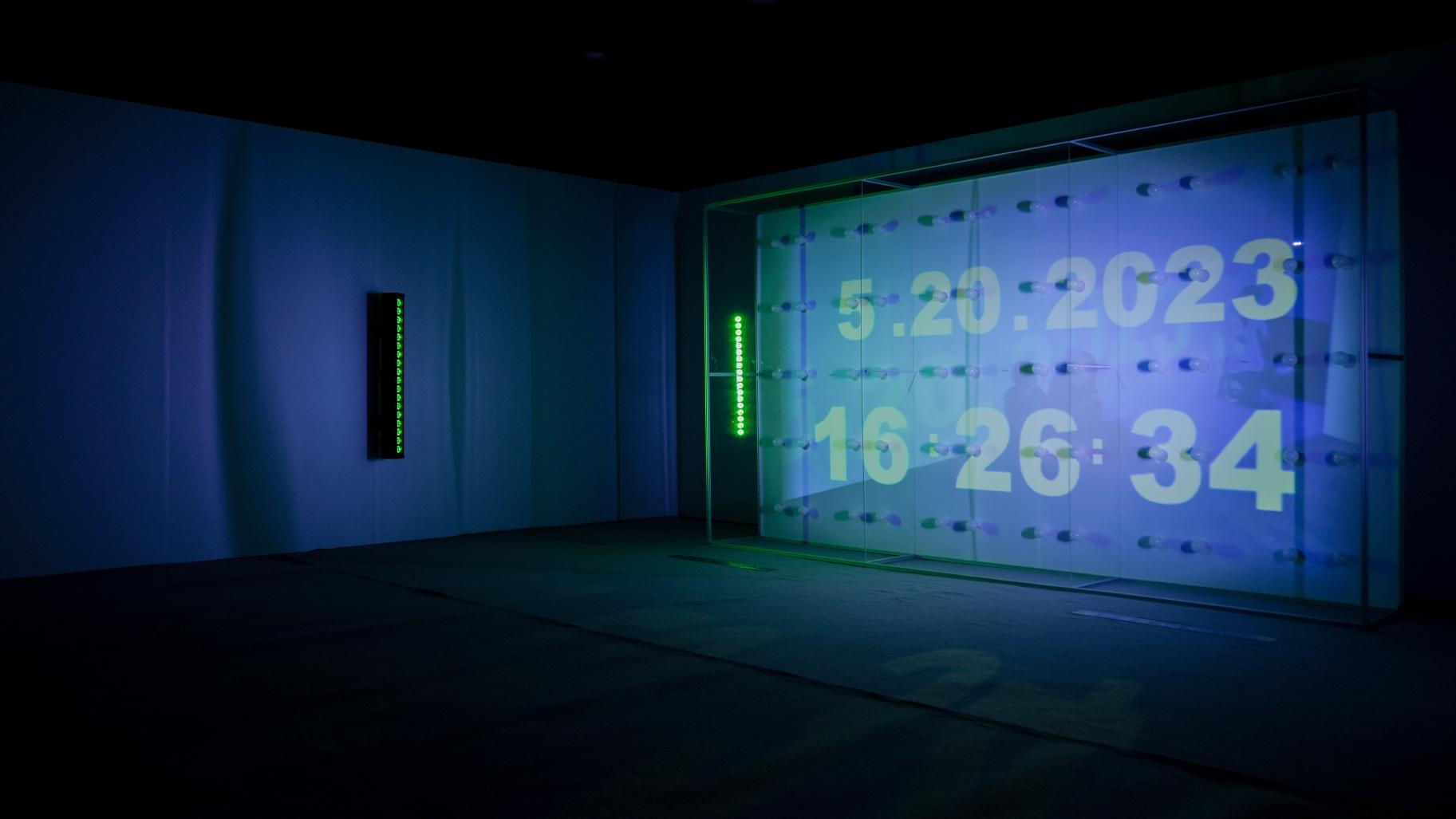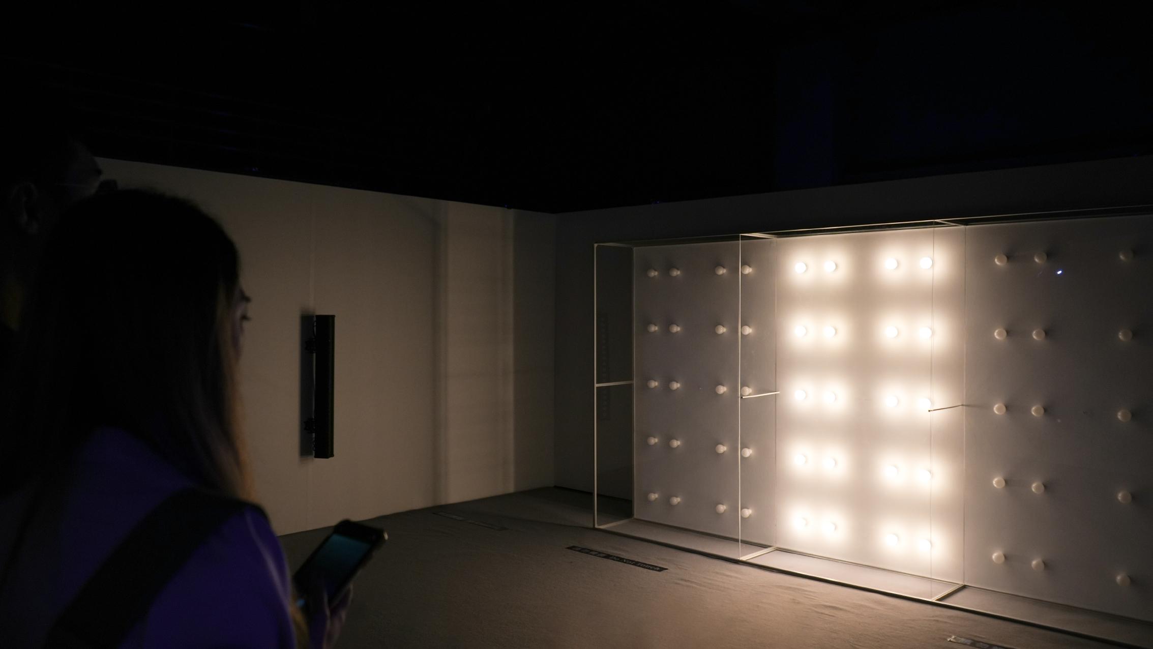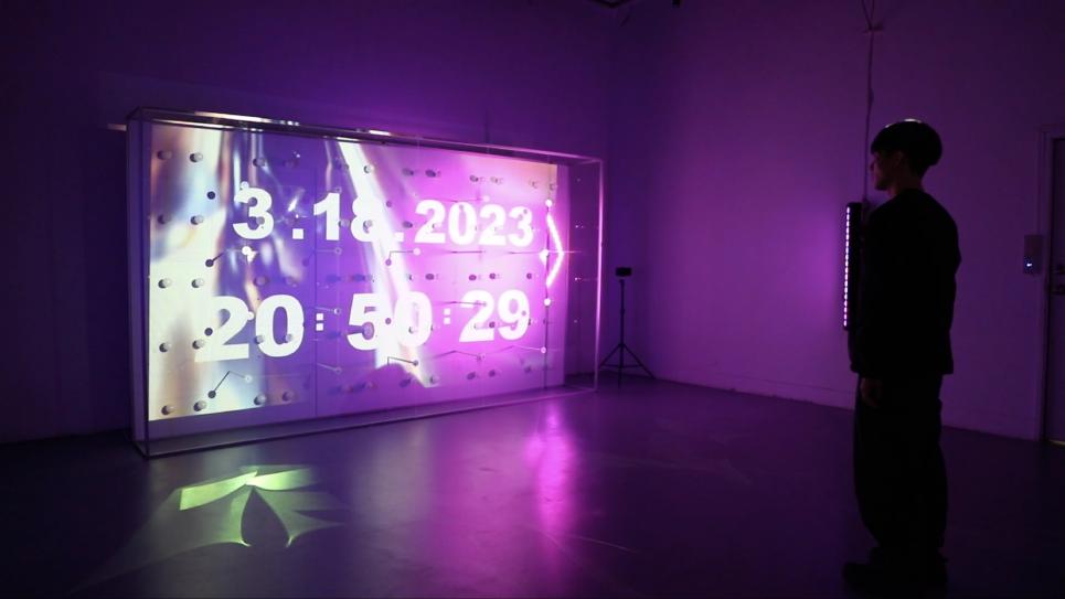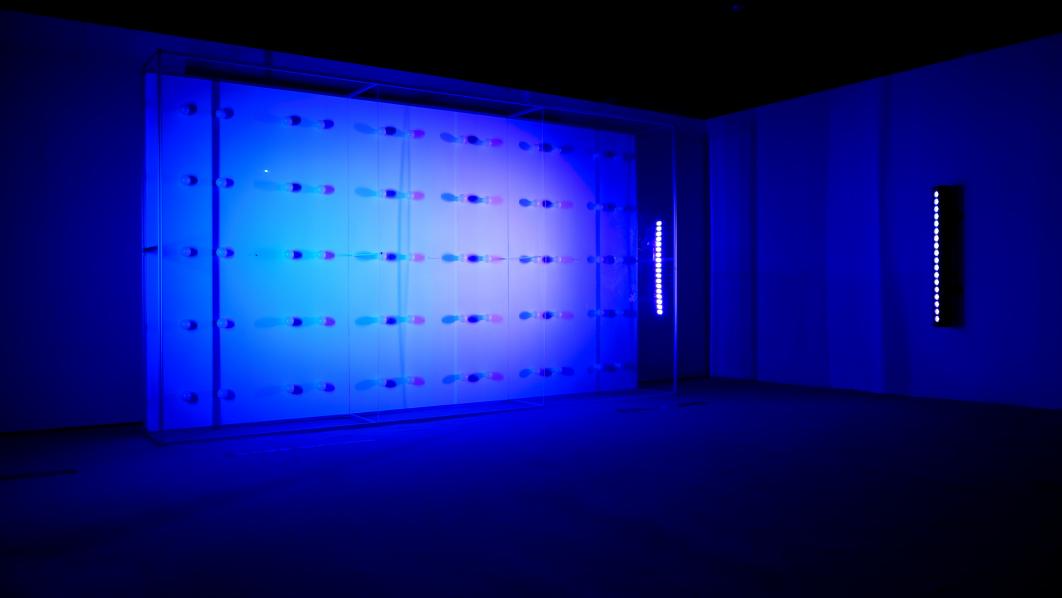 讀著入口泛藍光的作品牌,一道詩意、模糊卻不失清晰的人聲正準備娓娓道來。踏著灰白的地毯 緩慢步入展場中,映入眼簾正的是一堵大型、白皙且明亮的燈牆,一座鑲嵌著六十顆日光燈泡並 結合鋁結構與透明壓克力板的燈光裝置,同時兩側與上方有電腦燈與投影機持續發著光。裝置的 牆面映照現場光源渲染的色光,時而溫暖和煦;偶時凜冽明晰;有時驚見自己;最終閃爍自明。