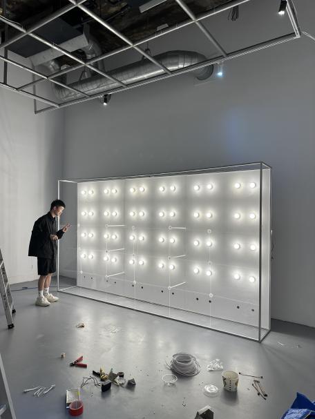 作品中運用「光敏電阻、燈泡」兩個核心元素,將其串連在同一個迴路、裝置持續通電,當遇到 環境光源昏暗時將觸發光敏電阻、迴路與燈泡的拉鋸矛盾,產生持續通電又阻電的現象,這即會 產生物理上的高速閃爍。意即作品中燈泡牆在尾段的閃爍是源於環境光源全數關閉,物理性的觸 發了六十顆燈泡的閃爍,並非任何程式與電路板的控制。