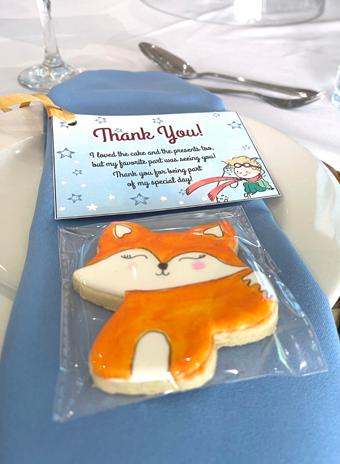 My tables were simple yet elegantly set. Pure white linens with beautiful woven base plates from Tales And Fairies events, topped with a plain white plate and powder blue linen napkin from my friend Johnny with delightful bespoke Little Prince character sugar cookies with thanks to Bake’t. Once again, the thank you cards were found online, which I printed out to give to each guest with their edible thank you gift.