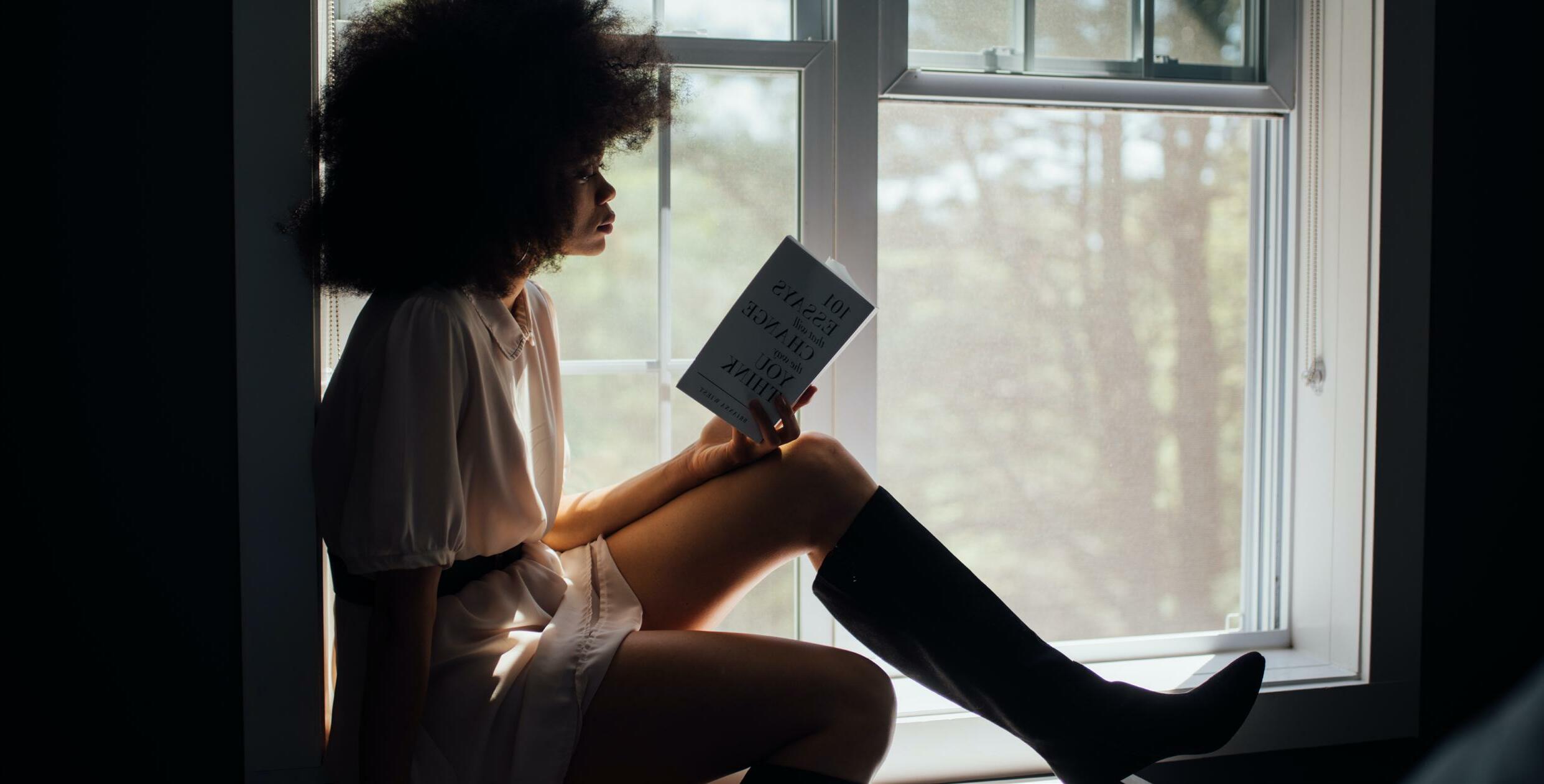 by Thought Catalog: https://www.pexels.com/photo/woman-sitting-on-window-reading-book-2228561/