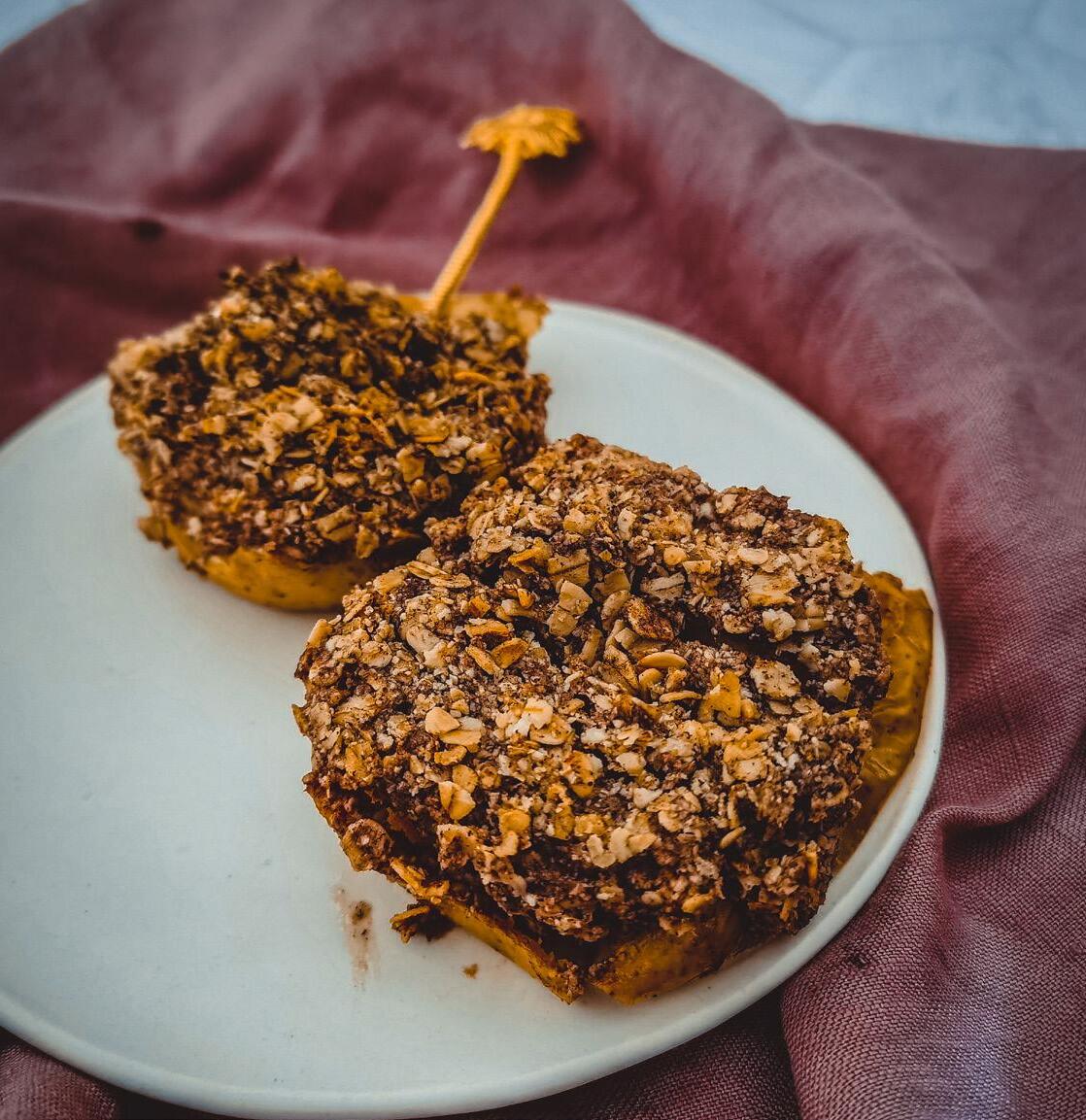 Place apples in a greased baking dish skin side down. Toss apples with oats and bake for 20 minutes until apples are soft.