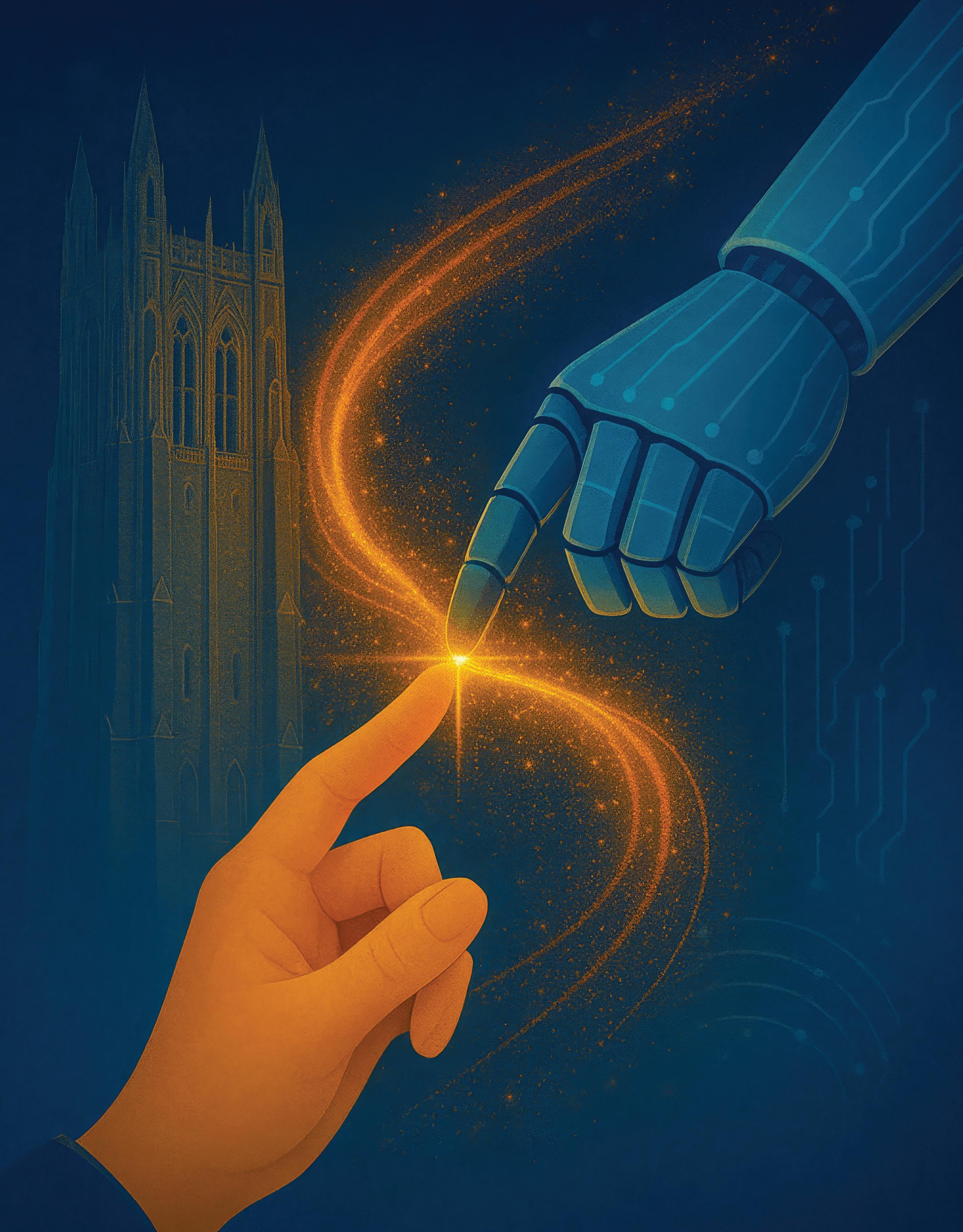 Artificial intelligence is transforming how we work at Duke, freeing time for higher-level thinking and reshaping how we teach, learn and interact. Graphic created with the assistance of artificial intelligence. Design &