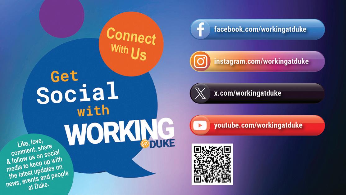 Stay informed and updated with the latest news, insights and glimpses into life at Duke by following Working@Duke on Facebook, Instagram, X and subscribing to the Working@Duke YouTube channel. These channels provide real-time updates and behind-the-scenes looks at the Duke experience.