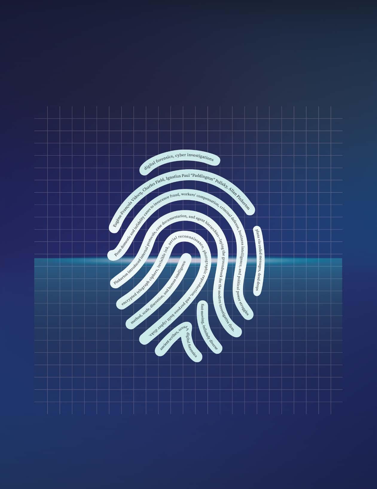 Private investigation as a discipline can be traced all the way to ancient Mesopotamia. Scribes often worked as informants in exchange for gold by uncovering plots against the royal family. However, it wasn’t until the 1800s that private investigation became a commercial service, with EugèneFrançois Vidocq, Charles Field, and Ignatius Paul “Paddington” Pollaky leading the charge. In fact, private investigation (formerly known as spy work) was paramount in winning the Revolutionary and Civil wars by smuggling information from opposing sides. It wouldn’t be for another century that private investigation would become a licensed profession, starting off by assisting clients in civil court cases. To read all about the history of private investigation, go to page 20.