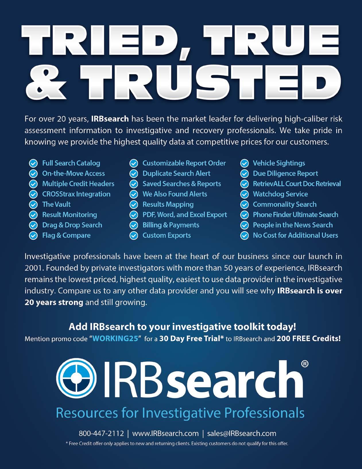 Working PI is published by OREP Insurance Services, LLC (Calif. Lic. #0K99465) and mailed to 25,000+ private investigators nationwide. The ads and specific mention of any proprietary product contained within are a service to readers and do not imply endorsement by Working PI. No claims, representations or guarantees are made or implied by their publication. The contents of this publication may not be reproduced either in whole or in part without written consent.