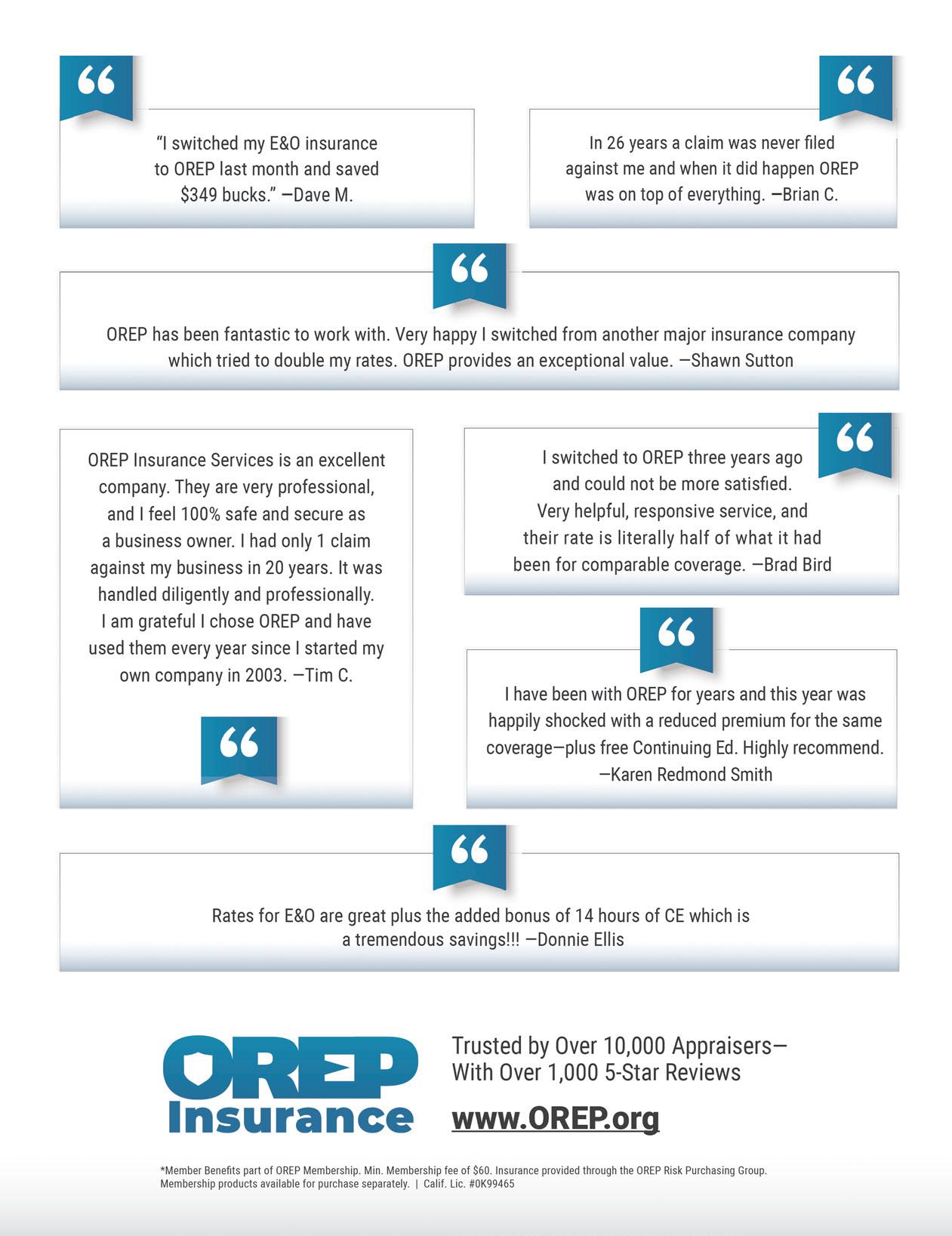 Today, Lanham says he is very cognizant of the need for insurance to include ample discrimination claim coverage. “I actually went back to one of my old insurance agents and I told them that $100,000 isn’t going to cut it. I really think appraisers are willing to pay a higher insurance premium to have more coverage for these claims. It’s worth it. I think having $250,000 in coverage would allow appraisers to actually get through a trial and defend themselves,” Lanham says. (OREP’s primary E&O policy includes $200,000 of Discrimination Coverage at no additional cost, with up to $500,000 available for a small additional premium—Visit OREP.org today.)