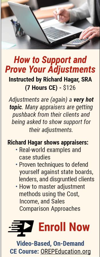 Richard Hagar, SRA, is an educator, author and owner of a busy appraisal office in the state of Washington. Hagar now offers his legendary adjustments course for CE credit in over 45 states through OREPEducation.org. The 7-hour online CE course “How to Support and Prove Your Adjustments” shows appraisers proven methods for supporting adjustments. OREP members save on this approved coursework. Sign up today at OREPEducation.org Reach Richard Hagar via email at rh@richardhagar.com.