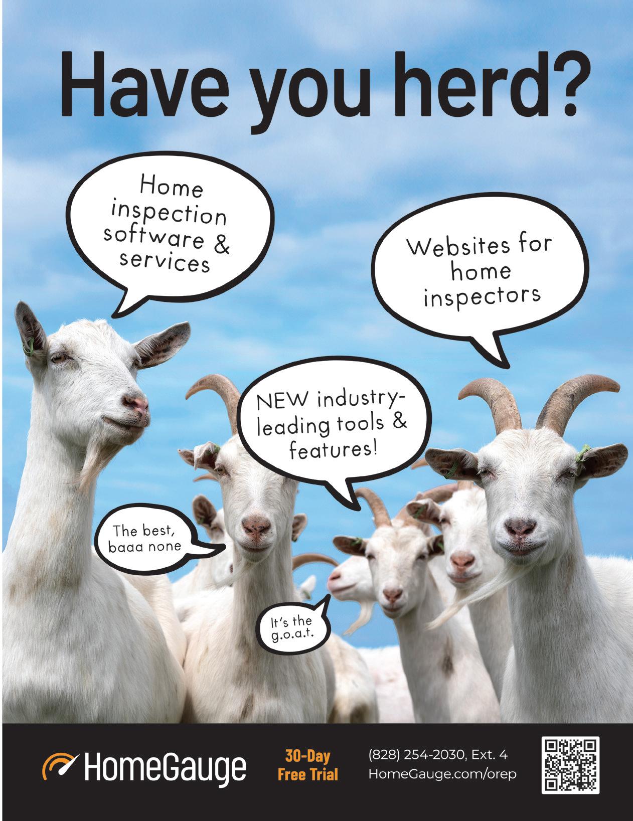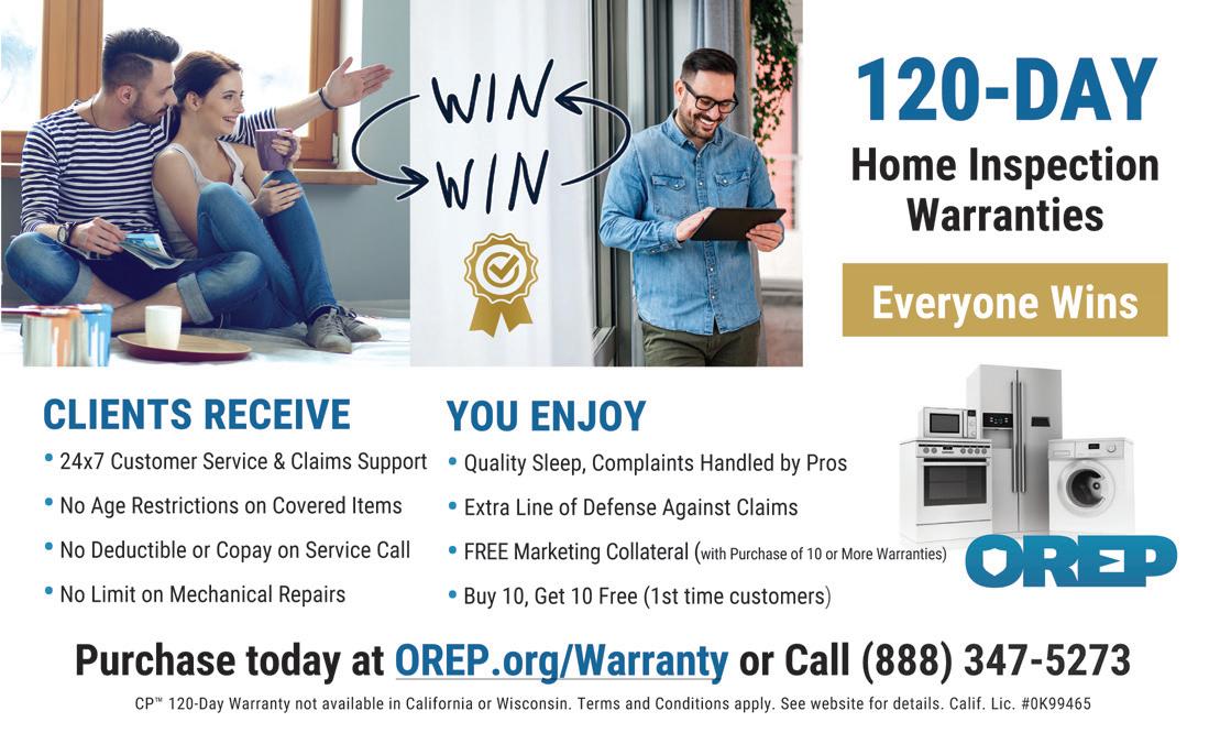 ONLINE Get the latest home inspection news and information twice a month. www.workingre.com Working RE OPT in OREP Members enjoy this software for FREE. For more information, visit OREP.org/inspectors. The scheduled release date for Serve You Reviews is June 1, 2024. Calif. Lic. #0K99465