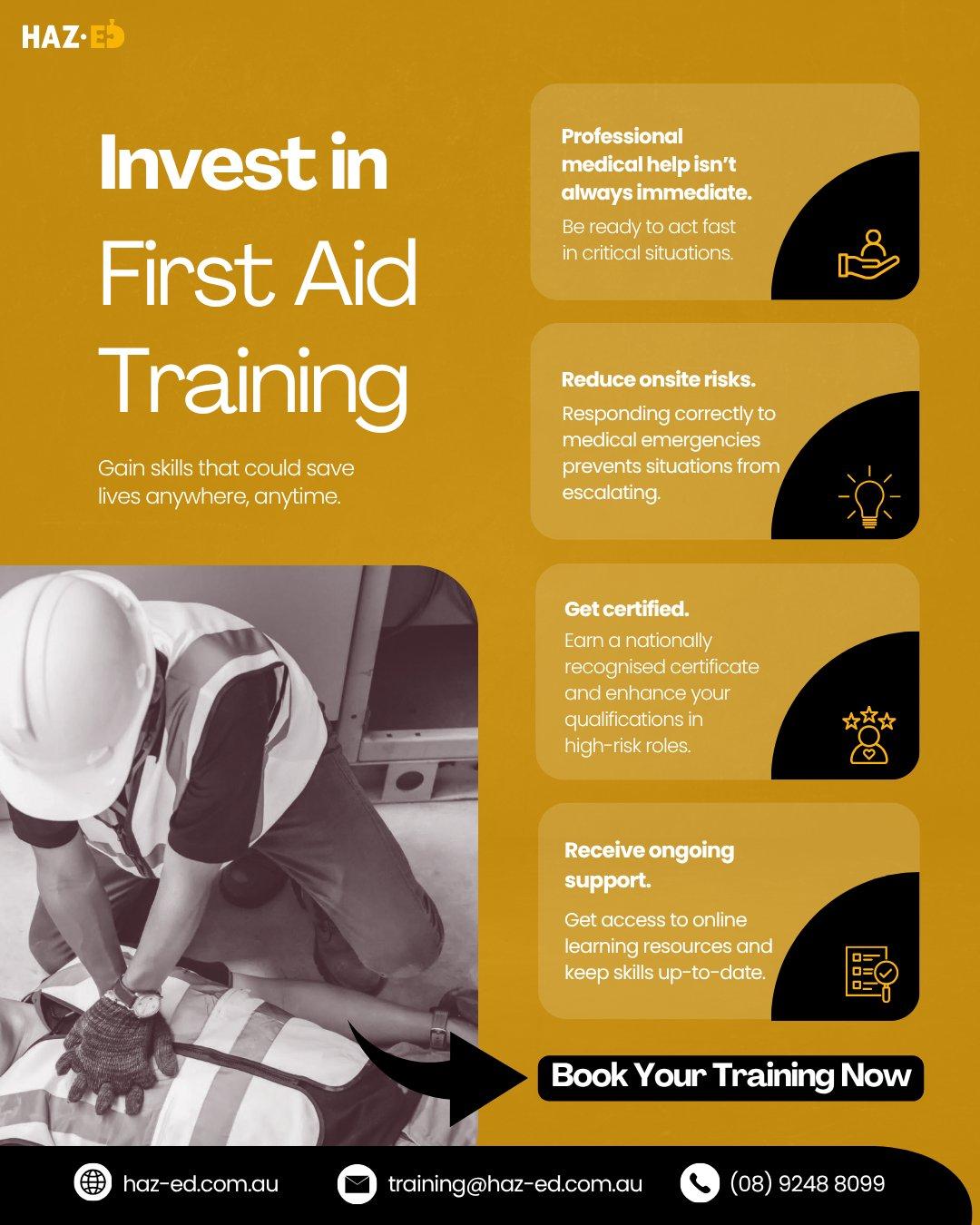 This infographic highlights the benefits of investing in first aid training provided by a Registered Training Organisation, such as Haz-Ed, an Australian-owned safety training provider based in Perth.