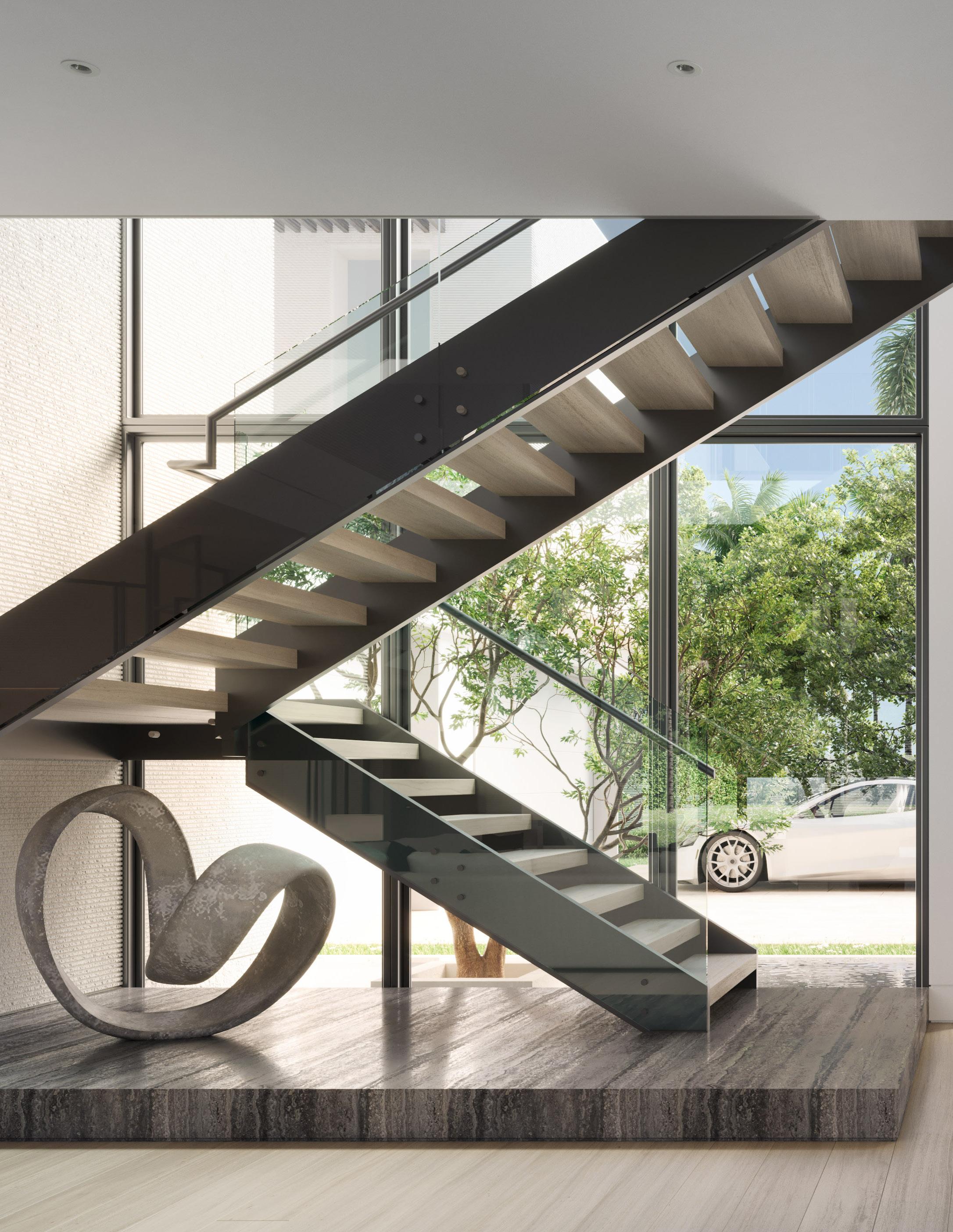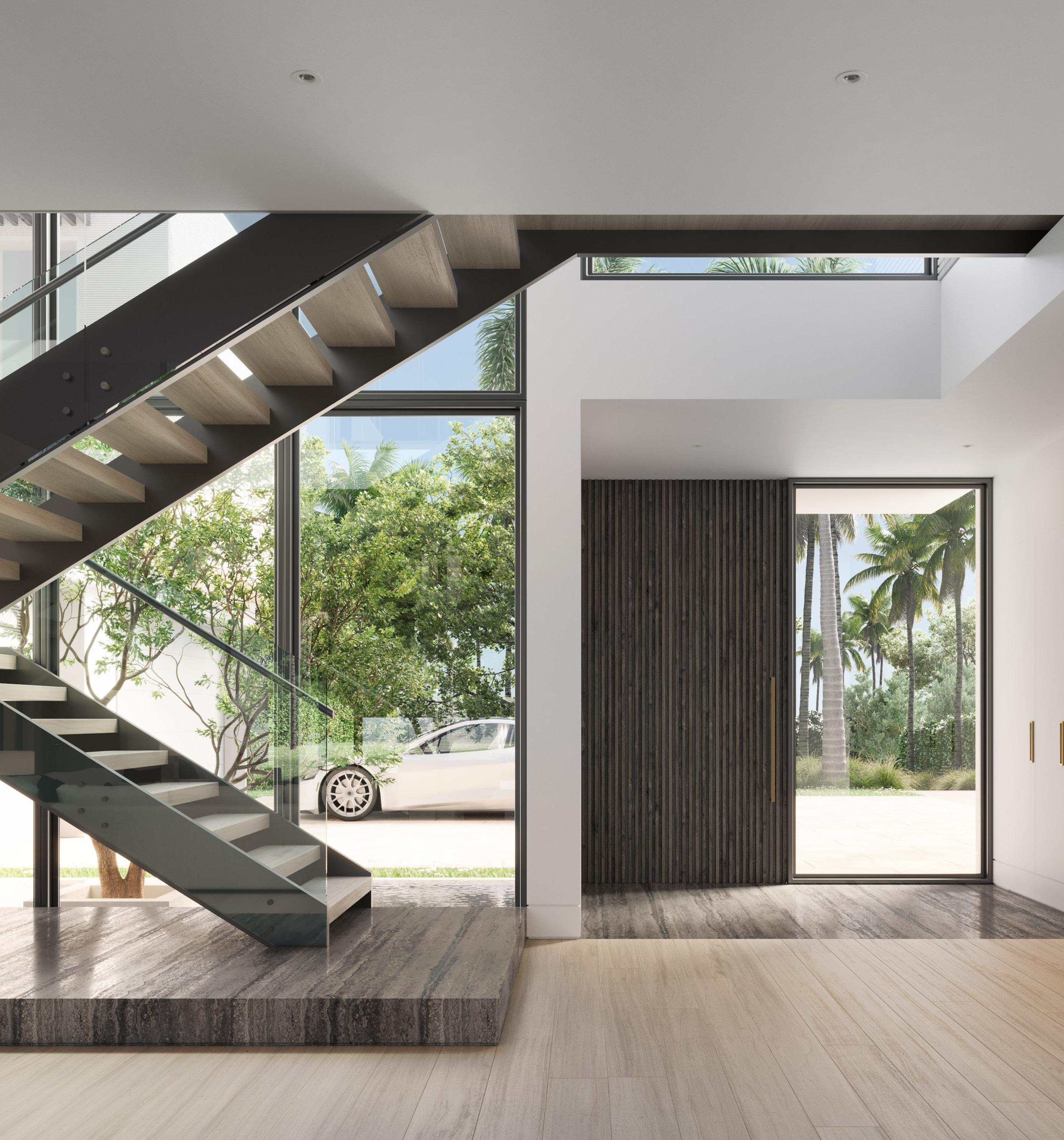 An artful composition of vertical and horizontal planes defines the home’s entry volumes, leading to the double height living room atrium that stitches the house together. Its rooms pinwheel out from this central atrium – framed by a dramatic stair and reflecting pools – reaching towards the street and Intracoastal.