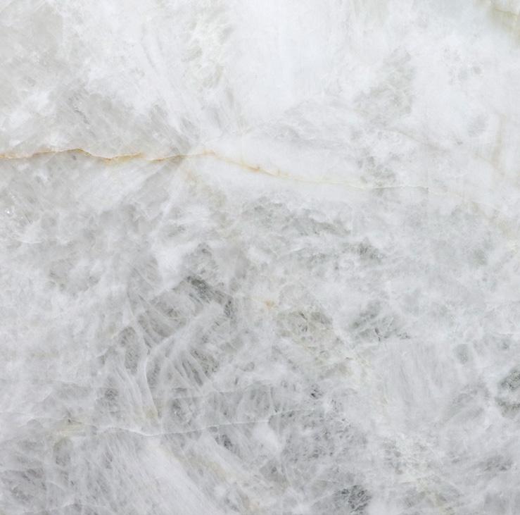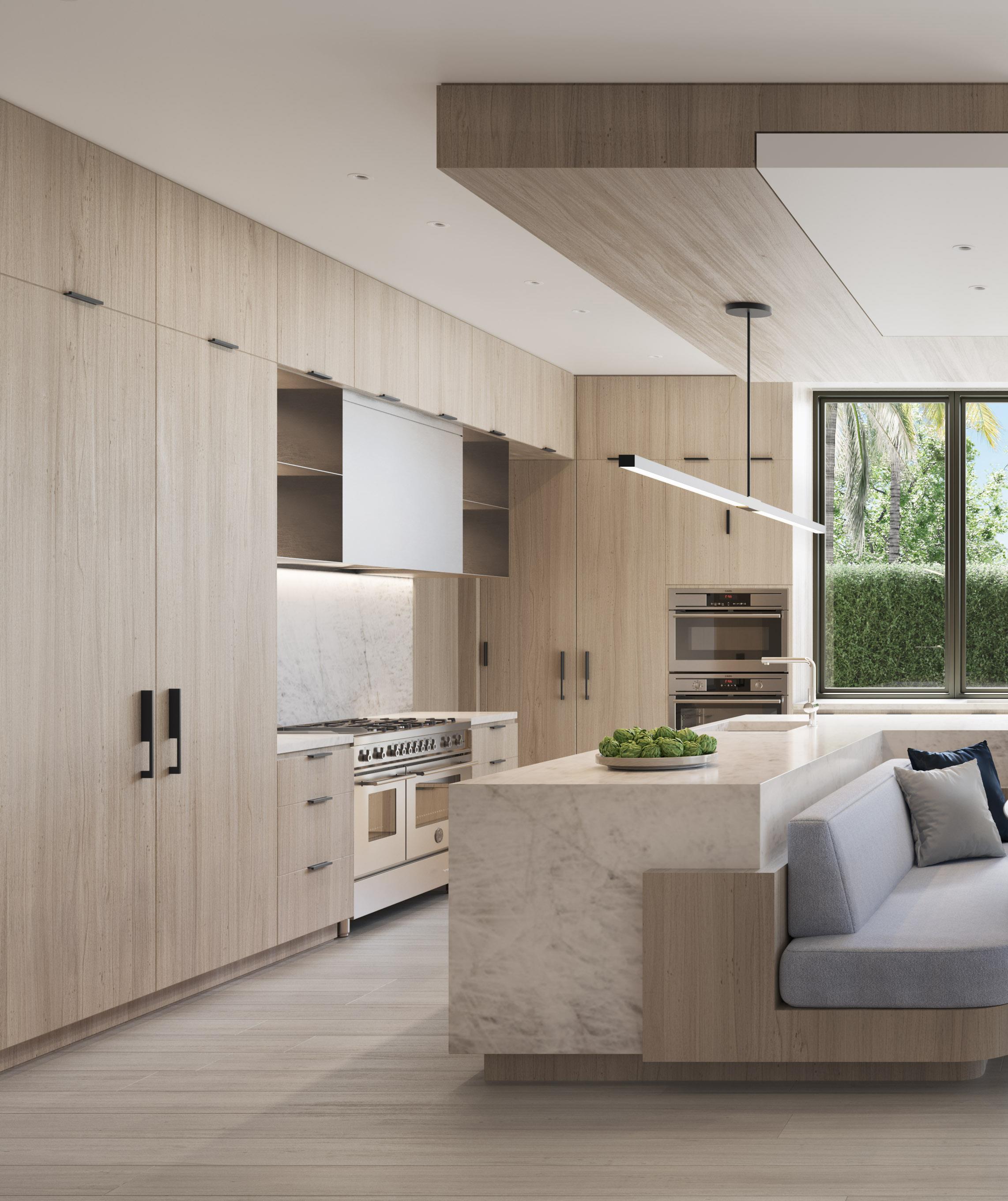 Chef’s Kitchen wih Modern Oak Millwork and Cristallo Quartzite Counters/ Island with Integrated Seating