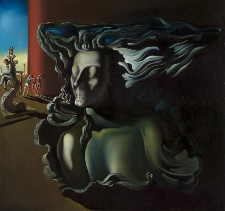 In Sleep (1937), Dalí paints a giant head, levitating and supported by fragile crutches. The skin is stretched, weightless, barely held together. The painting is a metaphor for dreaming itself, both essential and unstable, propped up by delicate constructs.