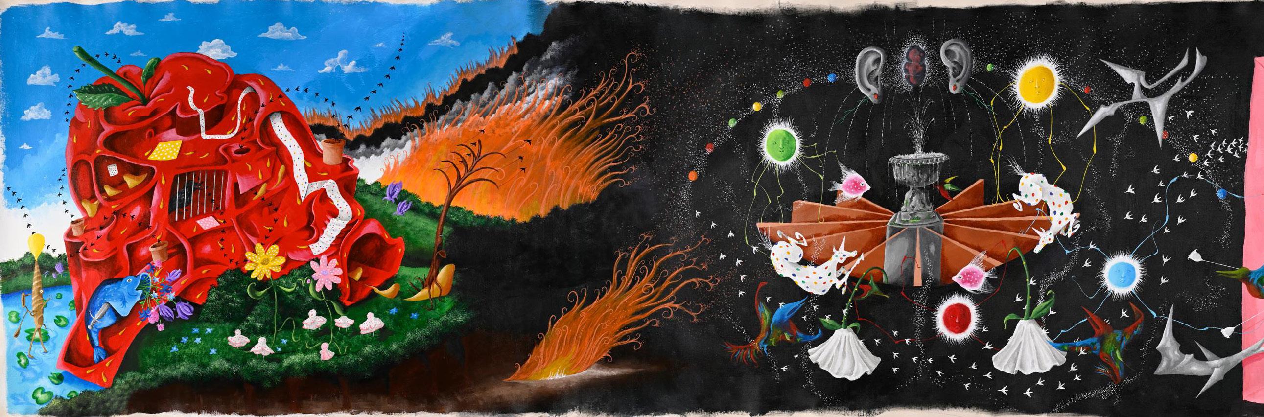 Rather than illustrating events, these works channel emotions, energies, and inner states. Each canvas feels like a dream preserved on paper, not a memory, but a vibration.