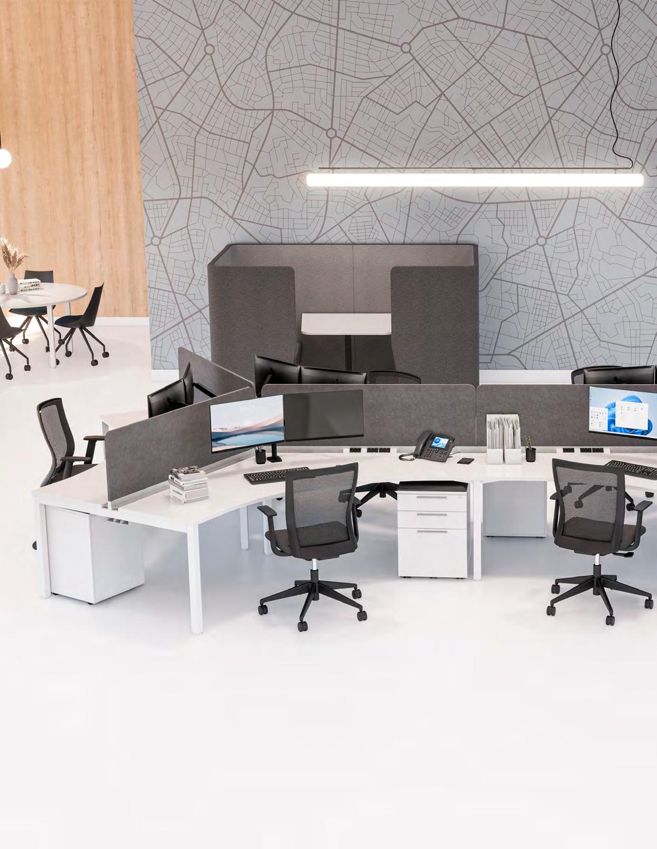 Revitalize your traditional office space with refreshing alternatives to conventional 90° layouts, giving you the flexibility to design your work environment to your specific needs. By using frame-mounted screens in high-traffic areas, you can create a functional and stylish space while retaining convenient access to power and data functions.