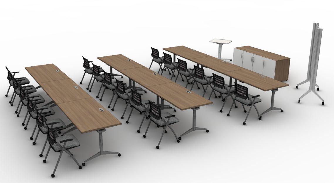 Total for setting (as shown): $7,692 A. UNIVERSAL D-SHAPED DESK $1,081 B. CALIBRATE OVERHEAD $882 C. CALIBRATE BRIDGE $169