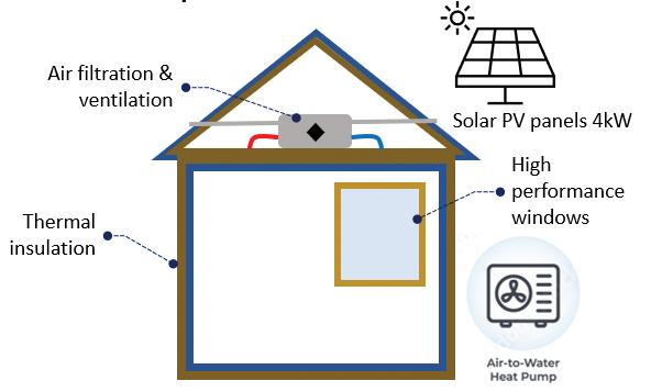 The home on the left has been fully thermally renovated (including wall and roof insulation, and window replacement), and installed air filtration and ventilation systems, an air-water heat pump, and rooftop solar photovoltaic (PV) panels. The house would meet all requirements for thermal comfort and indoor air quality. The cost of the investment is US$35,398 with a simple payback period of about 14.2 years. Depending on the net metering or net billing system in place, which would allow the homeowner to sell the unused solar electricity to the grid to offset their bill, the monthly energy cost would be US$0-38.5 (US$0-461.5 per year).