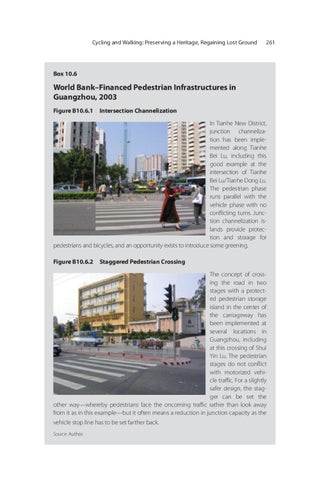 World Bank–Financed Pedestrian Infrastructures in Guangzhou, 2003 Figure B10.6.1 Intersection Channelization In Tianhe New District, junction channelization has been implemented along Tianhe Bei Lu, including this good example at the intersection of Tianhe Bei Lu/Tianhe Dong Lu. The pedestrian phase runs parallel with the vehicle phase with no conflicting turns. Junction channelization islands provide protection and storage for pedestrians and bicycles, and an opportunity exists to introduce some greening. Figure B10.6.2 Staggered Pedestrian Crossing The concept of crossing the road in two stages with a protected pedestrian storage island in the center of the carriageway has been implemented at several locations in Guangzhou, including at this crossing of Shui Yin Lu. The pedestrian stages do not conflict with motorized vehicle traffic. For a slightly safer design, the stagger can be set the other way—whereby pedestrians face the oncoming traffic rather than look away from it as in this example—but it often means a reduction in junction capacity as the vehicle stop line has to be set farther back. Source: Author.