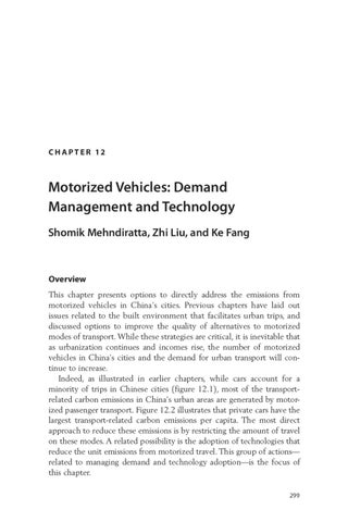 Overview This chapter presents options to directly address the emissions from motorized vehicles in China’s cities. Previous chapters have laid out issues related to the built environment that facilitates urban trips, and discussed options to improve the quality of alternatives to motorized modes of transport. While these strategies are critical, it is inevitable that as urbanization continues and incomes rise, the number of motorized vehicles in China’s cities and the demand for urban transport will continue to increase. Indeed, as illustrated in earlier chapters, while cars account for a minority of trips in Chinese cities (figure 12.1), most of the transportrelated carbon emissions in China’s urban areas are generated by motorized passenger transport. Figure 12.2 illustrates that private cars have the largest transport-related carbon emissions per capita. The most direct approach to reduce these emissions is by restricting the amount of travel on these modes. A related possibility is the adoption of technologies that reduce the unit emissions from motorized travel. This group of actions— related to managing demand and technology adoption—is the focus of this chapter. 299