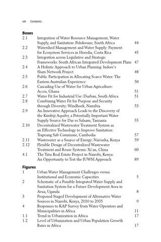 Integration of Water Resource Management, Water Supply, and Sanitation: Polokwane, South Africa Watershed Management and Water Supply: Payment for Ecosystem Services in Heredia, Costa Rica Integration across Legislative and Strategic Frameworks: South African Integrated Development Plans A Holistic Approach to Urban Planning: Indore’s Slum Network Project Public Participation in Allocating Scarce Water: The Eastern Australian Experience Cascading Use of Water for Urban Agriculture: Accra, Ghana Water Fit for Industrial Use: Durban, South Africa Combining Water Fit for Purpose and Security through Diversity: Windhoek, Namibia An Innovative Approach Leads to the Discovery of the Kimbiji Aquifer, a Potentially Important Water Supply Source for Dar es Salaam, Tanzania Decentralized Wastewater Treatment System as an Effective Technology to Improve Sanitation: Trapeang Sab Commune, Cambodia Wastewater as a Source of Energy: Naivasha, Kenya Flexible Design of Decentralized Wastewater Treatment and Reuse Systems: Xi’an, China The Tatu Real Estate Project in Nairobi, Kenya: An Opportunity to Test the IUWM Approach