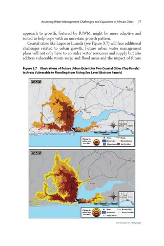 approach to growth, fostered by IUWM, might be more adaptive and suited to help cope with an uncertain growth pattern. Coastal cities like Lagos or Luanda (see Figure 3.7) will face additional challenges related to urban growth. Future urban water management plans will not only have to consider water resources and supply but also address vulnerable storm surge and flood areas and the impact of future Figure 3.7 Illustrations of Future Urban Extent for Two Coastal Cities (Top Panels) in Areas Vulnerable to Flooding from Rising Sea Level (Bottom Panels)