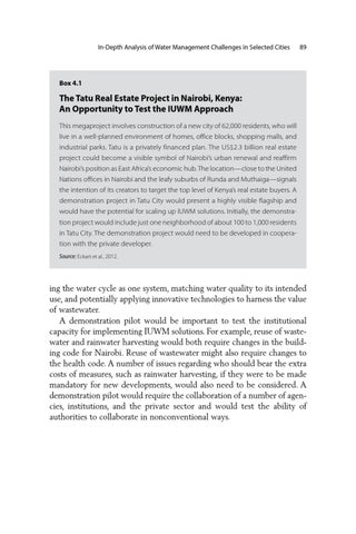 The Tatu Real Estate Project in Nairobi, Kenya: An Opportunity to Test the IUWM Approach This megaproject involves construction of a new city of 62,000 residents, who will live in a well-planned environment of homes, office blocks, shopping malls, and industrial parks. Tatu is a privately financed plan. The US$2.3 billion real estate project could become a visible symbol of Nairobi’s urban renewal and reaffirm Nairobi’s position as East Africa’s economic hub. The location—close to the United Nations offices in Nairobi and the leafy suburbs of Runda and Muthaiga—signals the intention of its creators to target the top level of Kenya’s real estate buyers. A demonstration project in Tatu City would present a highly visible flagship and would have the potential for scaling up IUWM solutions. Initially, the demonstration project would include just one neighborhood of about 100 to 1,000 residents in Tatu City. The demonstration project would need to be developed in cooperation with the private developer. Source: Eckart et al., 2012.