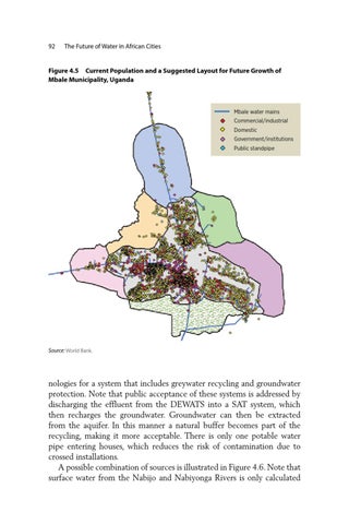nologies for a system that includes greywater recycling and groundwater protection. Note that public acceptance of these systems is addressed by discharging the effluent from the DEWATS into a SAT system, which then recharges the groundwater. Groundwater can then be extracted from the aquifer. In this manner a natural buffer becomes part of the recycling, making it more acceptable. There is only one potable water pipe entering houses, which reduces the risk of contamination due to crossed installations. A possible combination of sources is illustrated in Figure 4.6. Note that surface water from the Nabijo and Nabiyonga Rivers is only calculated