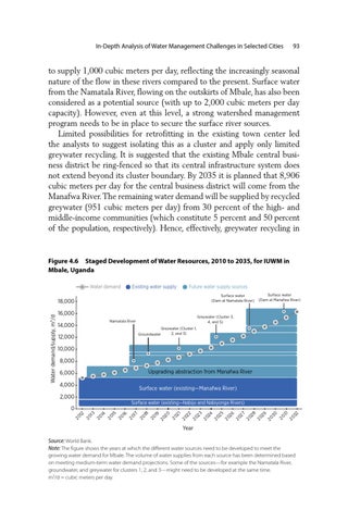 to supply 1,000 cubic meters per day, reflecting the increasingly seasonal nature of the flow in these rivers compared to the present. Surface water from the Namatala River, flowing on the outskirts of Mbale, has also been considered as a potential source (with up to 2,000 cubic meters per day capacity). However, even at this level, a strong watershed management program needs to be in place to secure the surface river sources. Limited possibilities for retrofitting in the existing town center led the analysts to suggest isolating this as a cluster and apply only limited greywater recycling. It is suggested that the existing Mbale central business district be ring-fenced so that its central infrastructure system does not extend beyond its cluster boundary. By 2035 it is planned that 8,906 cubic meters per day for the central business district will come from the Manafwa River. The remaining water demand will be supplied by recycled greywater (951 cubic meters per day) from 30 percent of the high- and middle-income communities (which constitute 5 percent and 50 percent of the population, respectively). Hence, effectively, greywater recycling in
