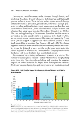 Security and cost effectiveness can be enhanced through diversity and clustering. Arua has a diversity of sources that it can tap, and that might provide sufficient water. These include surface water secured through enhanced watershed protection, groundwater, water reuse through greywater recycling, and (to a limited extent) wastewater reuse. Based on unit costs obtained from NWSC, these solutions are all likely to be more cost effective than using water from the Olewa River (Eckart et al., 2012b). The cost and applicability of the solutions depend on local factors such as whether the city already exists or is expected to be built by 2035, socioeconomic status, groundwater well location, and topography. Eckart et al. (2012b) suggest an approach in which different clusters of Arua implement different solutions (see Figures 4.11 and 4.12). The cluster approach would be more cost effective because the system for each cluster would be designed to meet specific needs. More importantly, the cluster approach is adaptive and can respond to changing conditions in the future with more flexibility than a centralized system. Protection of the existing surface-water resource is a priority. The viability of this integrated solution—and all other solutions except getting water from the Nile—depends on halting and reversing the negative impacts on surface water in the Enyau River from upstream activities. Upstream watershed protection and improvement are multidimensional Figure 4.11 Unit Cost for Staged Development of Use of Sources for IUWM in Arua, Uganda .