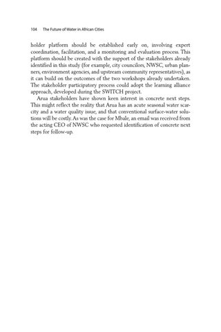 holder platform should be established early on, involving expert coordination, facilitation, and a monitoring and evaluation process. This platform should be created with the support of the stakeholders already identified in this study (for example, city councilors, NWSC, urban planners, environment agencies, and upstream community representatives), as it can build on the outcomes of the two workshops already undertaken. The stakeholder participatory process could adopt the learning alliance approach, developed during the SWITCH project. Arua stakeholders have shown keen interest in concrete next steps. This might reflect the reality that Arua has an acute seasonal water scarcity and a water quality issue, and that conventional surface-water solutions will be costly. As was the case for Mbale, an email was received from the acting CEO of NWSC who requested identification of concrete next steps for follow-up.