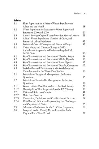Slum Population as a Share of Urban Population in Africa and the World 18 Urban Population with Access to Water Supply and Sanitation 2000 and 2010 20 Annual Average Capital Expenditure for African Utilities 21 Africa’s Urban Population, Number of Cities, and Percent of Urban Population 35 Estimated Cost of Droughts and Floods in Kenya 37 Cities, Water, and Climate Change in 2050: An Indicator Approach to Understanding the Risk for 31 Cities 80 Key Characteristics and Location of Nairobi, Kenya 84 Key Characteristics and Location of Mbale, Uganda 90 Key Characteristics and Location of Arua, Uganda 97 Key Characteristics and Location of Douala, Cameroon 105 Stakeholders and Participants at the Workshops and Consultations for the Three Case Studies 110 Principles of Integrated Management: Evaluative Questions 115 Principles of Sustainable Management: Evaluative Questions 116 Water Utilities That Responded to the KAP Survey 129 Municipalities That Responded to the KAP Survey 130 Cities and Selection Criteria 141 Main Data Sources 149 Calculation, Definition, and Codification of Intervals 154 Variables and Indicators Representing the Challenges and Capacities of Cities 155 Selection of Indicators for the 31 Cities Diagnostic 158 Imagery Used to Classify Urban Extent for Each City and Each Time Period 177