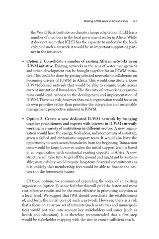 the World Bank Institute on climate change adaptation. ICLEI has a number of members in the local government sector in Africa. While it does not seem that ICLEI has the capacity to undertake the leadership of such a network it would be an important supporting partner in the initiative. • Option 2: Consolidate a number of existing African networks in an IUWM initiative. Existing networks in the area of water management and urban development can be brought together for an IUWM initiative. This could be done by getting selected networks to collaborate on becoming drivers of IUWM in Africa. This would constitute a loose IUWM-focused network that would be able to communicate across current institutional boundaries. The diversity of networking organizations could lend richness to the development and implementation of IUWM. There is a risk, however, that each organization would focus on its own priorities rather than prioritize the integration and sustainable management perspective inherent in IUWM. • Option 3: Create a new dedicated IUWM network by bringing together practitioners and experts with interest in IUWM currently working in a variety of institutions in different sectors. A new organization would have the energy, fresh ideas, and momentum of a start up, given a skilled and enthusiastic support team. It would also have the opportunity to work across boundaries from the beginning. Transaction costs would be large, however, unless the initial support team is based in an organization with substantial existing capacity in Africa. A new structure will take time to get off the ground and might not be sustainable; sustainability would require long-term financial commitments as it is unlikely that membership fees would be able to finance the network in the foreseeable future. Of these options, we recommend expanding the scope of an existing organization (option 1), as we feel that this will yield the fastest and most cost-effective results and be the most effective in promoting adoption at a local level. We suggest that IWA should coordinate the establishment of, and form the initial core of, such a network. However, there is a risk that a focus on a narrow set of interests (such as utilities and municipalities) would not take into account key stakeholders and issues (such as health and education). It is therefore recommended that a first step would be stakeholder mapping with the aim to ensure sufficient reach.