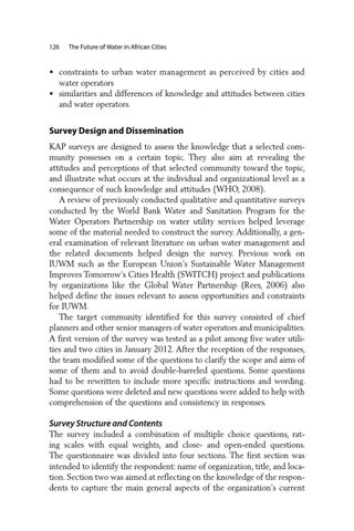 Survey Design and Dissemination KAP surveys are designed to assess the knowledge that a selected community possesses on a certain topic. They also aim at revealing the attitudes and perceptions of that selected community toward the topic, and illustrate what occurs at the individual and organizational level as a consequence of such knowledge and attitudes (WHO, 2008). A review of previously conducted qualitative and quantitative surveys conducted by the World Bank Water and Sanitation Program for the Water Operators Partnership on water utility services helped leverage some of the material needed to construct the survey. Additionally, a general examination of relevant literature on urban water management and the related documents helped design the survey. Previous work on IUWM such as the European Union’s Sustainable Water Management Improves Tomorrow’s Cities Health (SWITCH) project and publications by organizations like the Global Water Partnership (Rees, 2006) also helped define the issues relevant to assess opportunities and constraints for IUWM. The target community identified for this survey consisted of chief planners and other senior managers of water operators and municipalities. A first version of the survey was tested as a pilot among five water utilities and two cities in January 2012. After the reception of the responses, the team modified some of the questions to clarify the scope and aims of some of them and to avoid double-barreled questions. Some questions had to be rewritten to include more specific instructions and wording. Some questions were deleted and new questions were added to help with comprehension of the questions and consistency in responses.