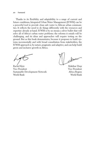 Thanks to its flexibility and adaptability to a range of current and future conditions, Integrated Urban Water Management (IUWM) can be a powerful tool to provide clean safe water to African urban communities. It reflects the need to do things differently with the resources and expertise already at hand. IUWM is by no means a silver bullet that will solve all of Africa’s urban water problems: the reforms it entails will be challenging, and its ideas and approaches will require testing on the ground. But as this book demonstrates, because it proposes to build systems incrementally and with broad consultation from stakeholders, the IUWM approach is, by nature, pragmatic and adaptive, and can help build green and inclusive growth in Africa.