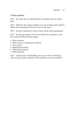 4. Open questions Q4.1 List what else you think should be included in the city urban plan. Q4.2 Rank the three major problems your city is facing with regard to urban water management (from the most to the least). Q4.3 List the constraints to achieve better urban water management. Q4.4 At what governance level do you think these problems can be best resolved? (Check all that apply.) • • • • • •